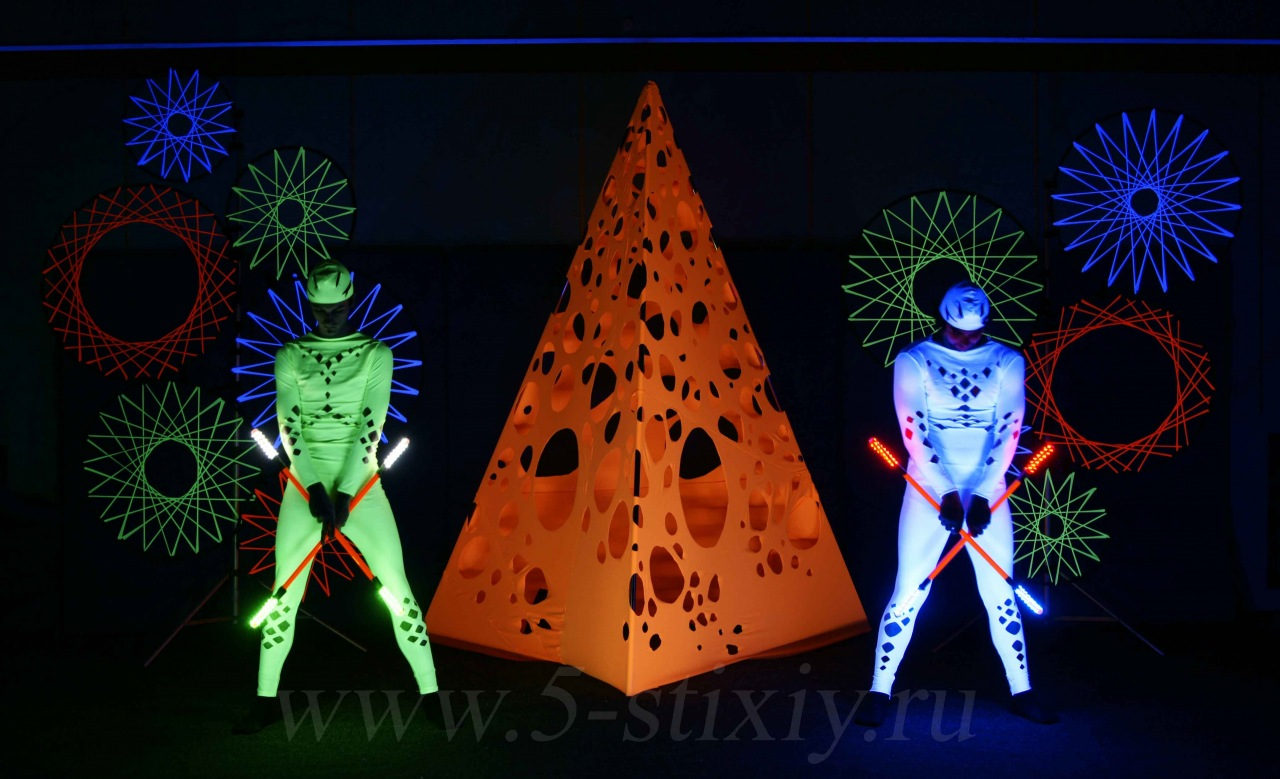 • LED Show - это светящиеся костюмы (мим-шоу, фрик-шоу), светодиодные пои и шесты, светящиеся веера, флуоресцентные флаги, ленты и пр.